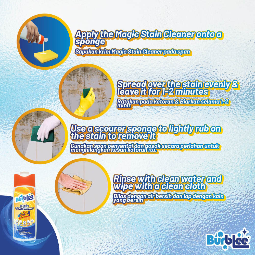Burblee PRO Magic Stain Cleaner is the ultimate solution for effortlessly removing stubborn watermarks and unsightly soap scum. This is your go-to cleaner for restoring cleanliness like a magic on glass, tiles or any bathroom surfaces.