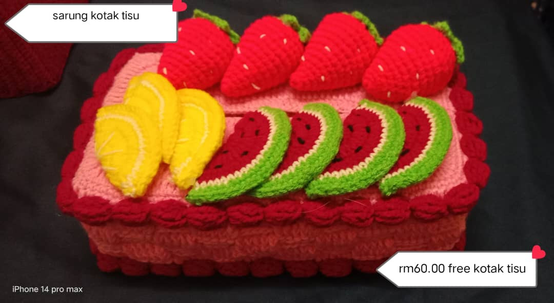 Saya menerima tempahan mengait seperti pelbagai jenis kotak tisu holder, pelbagai jenis keychain, car perfume holder, mask extender, sarung botol air, sling beg, beg telekung dan pelbagai variasi mengait...