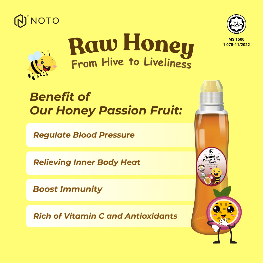 - Dihasilkan daripada madu asli dan diadun bersama pulpa markisa sebagai bahan utama.
