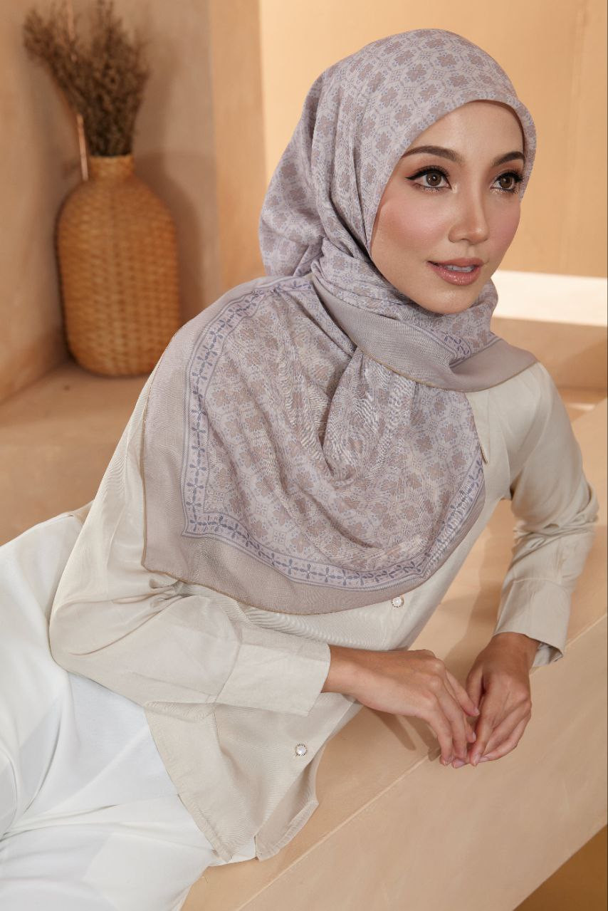 The "Feminine Treasures" hijab design elegantly blends modernity with heritage elements, featuring a monogram pattern intertwined with traditional motifs. The base colors of gray and cream create a sophisticated palette suitable for all occasions. This hijab adds a touch of elegance to your everyday look, ensuring you're effortlessly presentable no matter the setting.