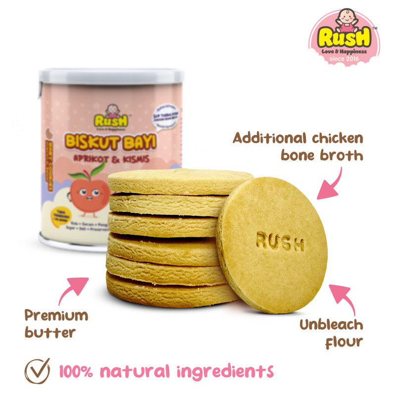 OF CHICKEN BONE BROTH * Help increase babies antibodies * Improve babies appetite * Strengthen growing bones & teeth * Supports immunity & digestion * Reduces the risk of allergies INGREDIENTS * Organic Chicken Bone Broth * Unsalted Butter * Unbleach Flour * Corn Flour * Tapioca Flour * Apricot Puree * Raisin Puree BONE BROTH COOKIES APRICOT RAISIN * Suitable for babies 7M+ * Made of Chicken Bone Broth * Ready to eat * No added sugar, salt, coloring & preservatives * Travel-friendly packaging Net Weight = 115g |