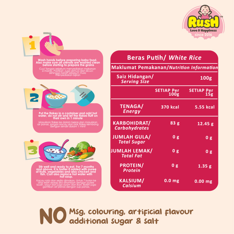 PORRIDGE PLAIN WHITE RICE * Suitable for babies 6M+ * Alternative to conventional porridge * Perfect for daily meal/travel * NO salt * NO colouring * NO Preservatives * Packed in reusable ziplock bag INDGREDIENT * 100% White Rice SERVING SUGGESTION * 6 months – Add 40ml of hot water (not warm) to 2 tablespoons of rice flakes. *7-11 months – Add 50ml of hot water (not warm) to 4 tablespoons of rice flakes. *1 year and above – Add 50ml of hot water (not warm) to 6 tablespoons of rice flakes. It is tastier if added with puree of fruit, vegetable and also chicken and fish. Can also replace hot water with hot soup. Net Weight = 150g |