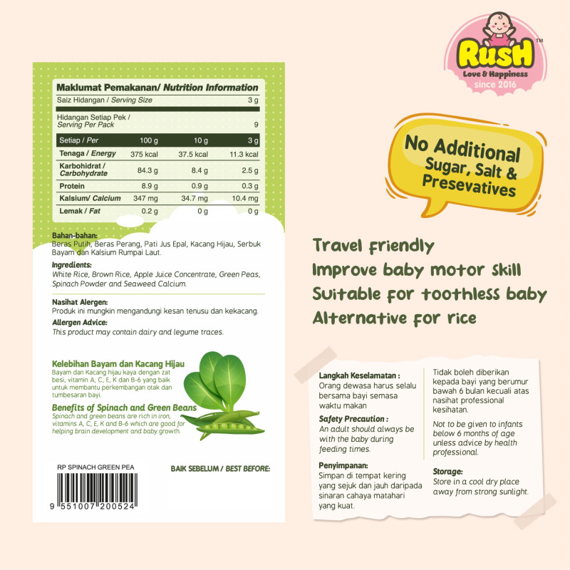 RICE PUFF GREEN PEAS * Suitable for babies 7M+ * Easy to handle * Convenient pack * Suitable for emergency snack * Suitable as a subtitute for rice * Ready to eat * Can be served as porridge/ cereal INGREDIENTS * White Rice * Brown Rice * Apple Juice Concentrate * Green Peas * Spinach Powder * Seaweed Calcium SERVING SUGGESTION * Eat just like that * Add hot water to serve as porridge * Add milk to serve as cereal Net Weight = 10g x 3 Pack |