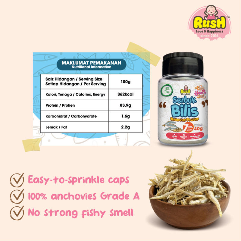 SEASONING ANCHOVIES POWDER * Suitable for 7M+ * Anchovies from Sabah * NO Added Sugar * NO Added Salt * NO Preservatives * NO Coluring * Easy to use adjustable bottle INDGREDIENT * 100% A grade Anchovies From Sabah BEST USE WITH : * Rush Baby Porridge * Rush Baby Cereal * Rush Baby Noodle Pumpkin Net Weight = 40g |