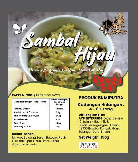 Sambal ready to eat yang sedap. Resepi original, rasa memukau. Boleh dimakan dengan nasi panas dan Ayam Goreng. Boleh juga dijadikan cicah cucur udang atau pisang goreng. Rasa pedas yang manja dan tidak menyegat tapi masih menggugat rasa.