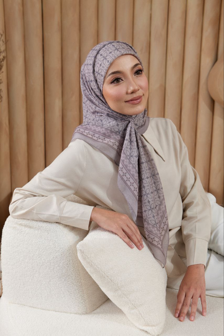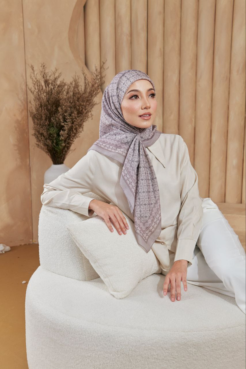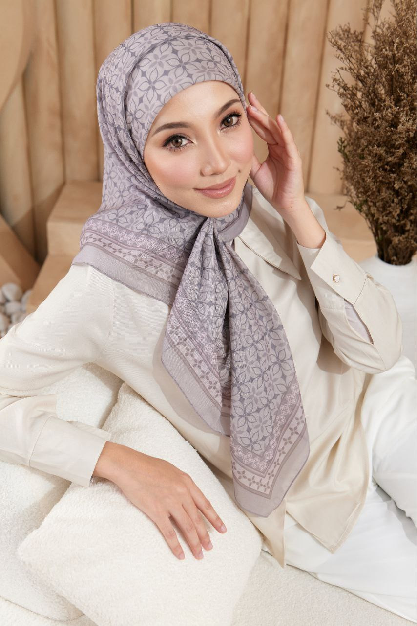 The "Feminine Treasures" hijab design elegantly blends modernity with heritage elements, featuring a monogram pattern intertwined with traditional motifs. The base colors of gray and cream create a sophisticated palette suitable for all occasions. This hijab adds a touch of elegance to your everyday look, ensuring you're effortlessly presentable no matter the setting.