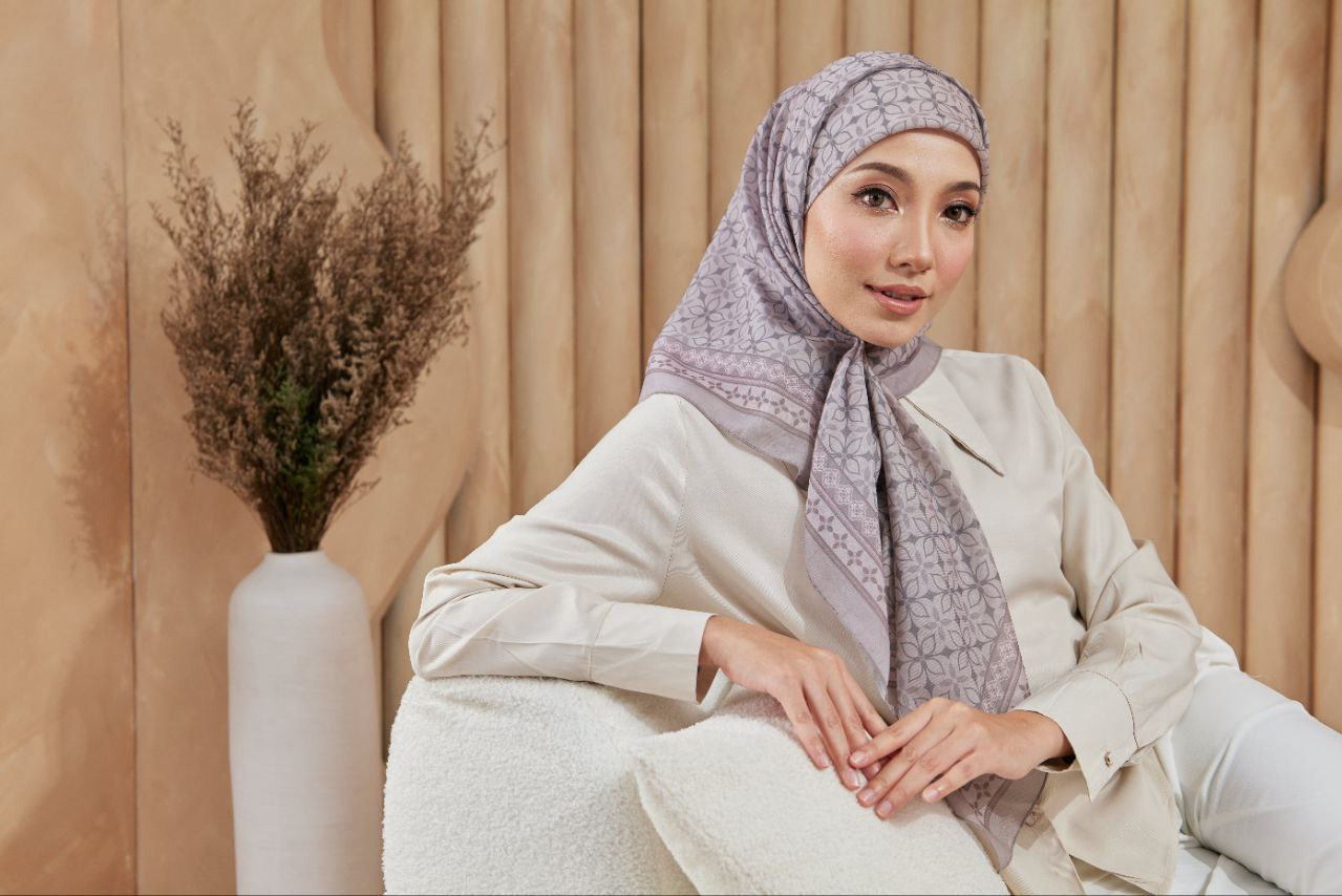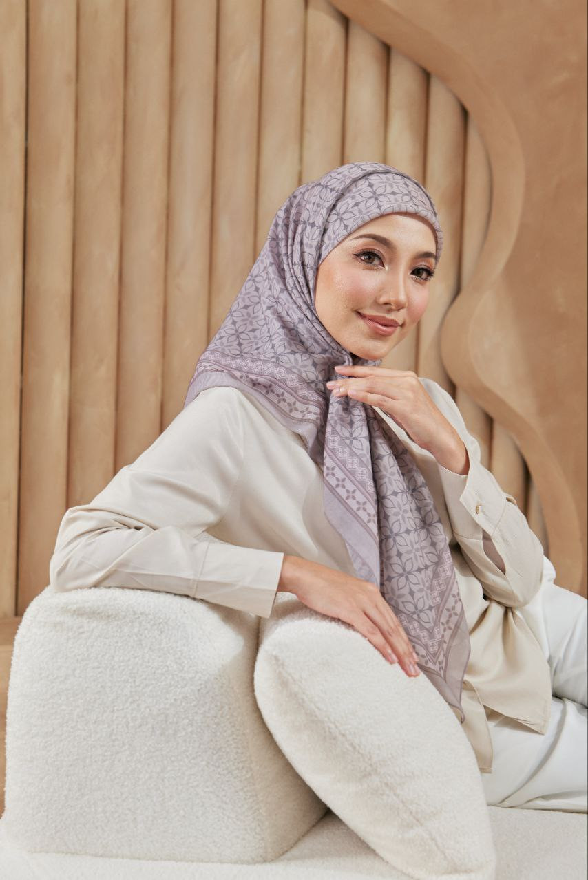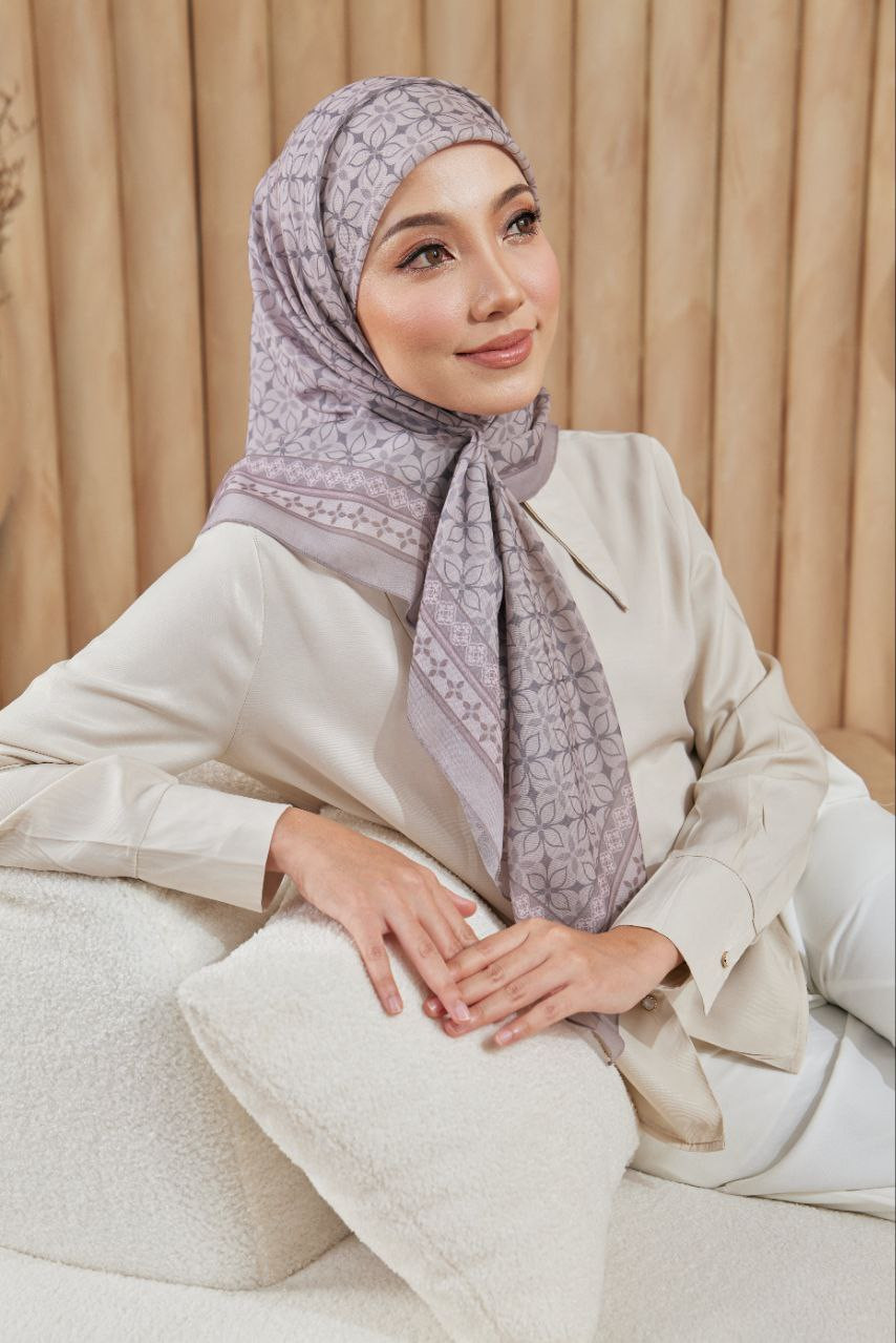 The "Feminine Treasures" hijab design elegantly blends modernity with heritage elements, featuring a monogram pattern intertwined with traditional motifs. The base colors of gray and cream create a sophisticated palette suitable for all occasions. This hijab adds a touch of elegance to your everyday look, ensuring you're effortlessly presentable no matter the setting.