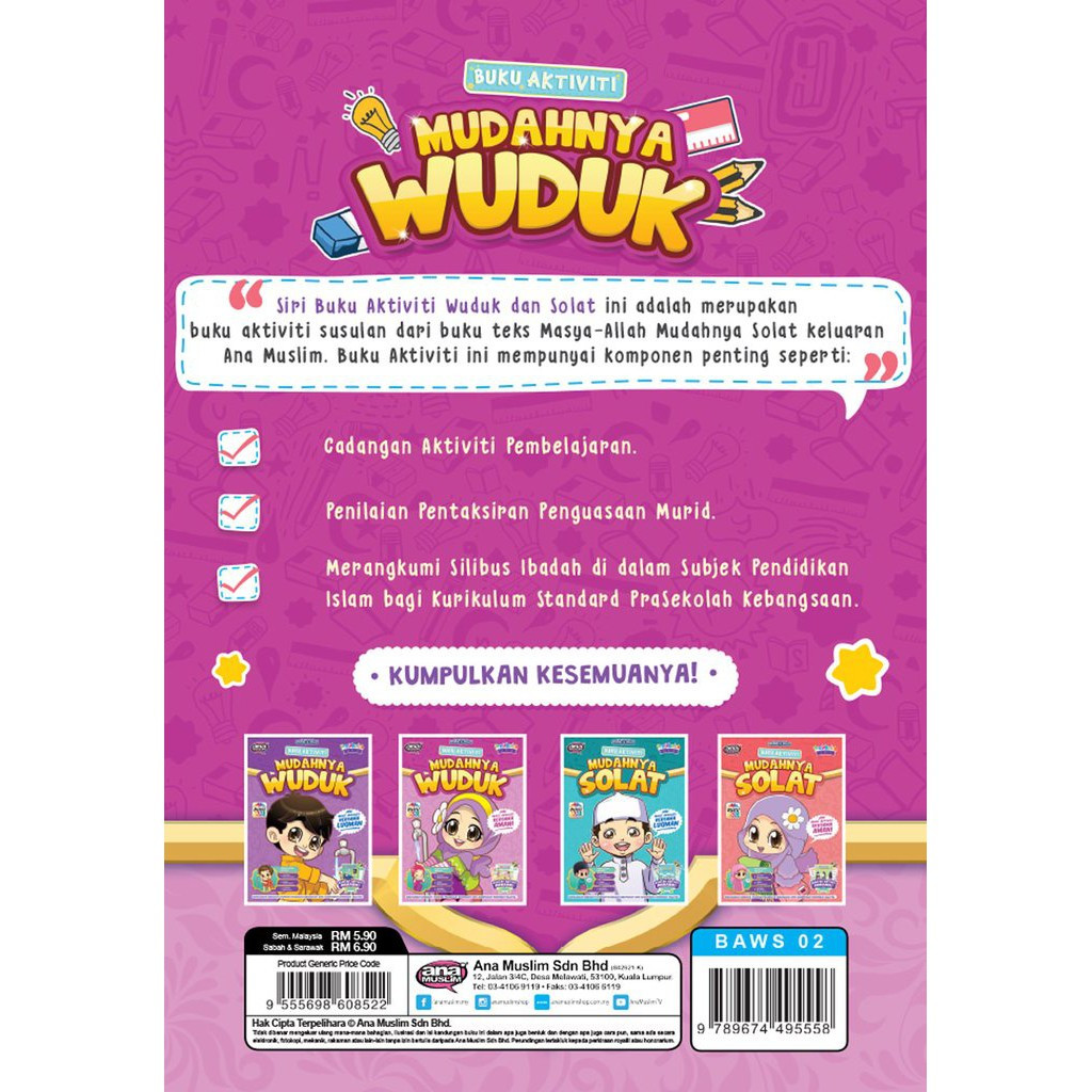 Masya-Allah Mudahnya Wuduk keluaran Ana Muslim. Buku aktiviti ini mempunyai kompenen penting seperti:
