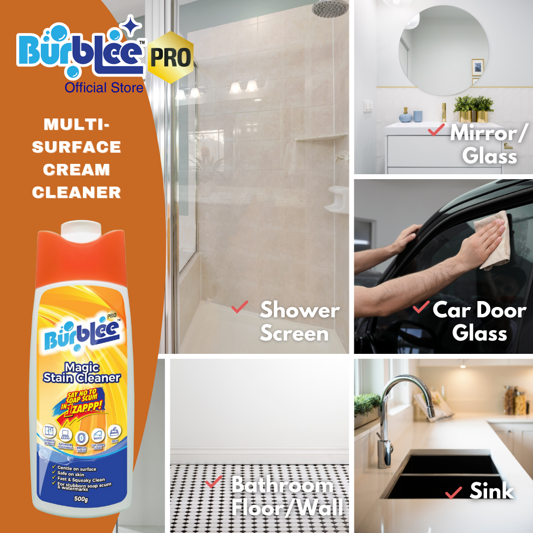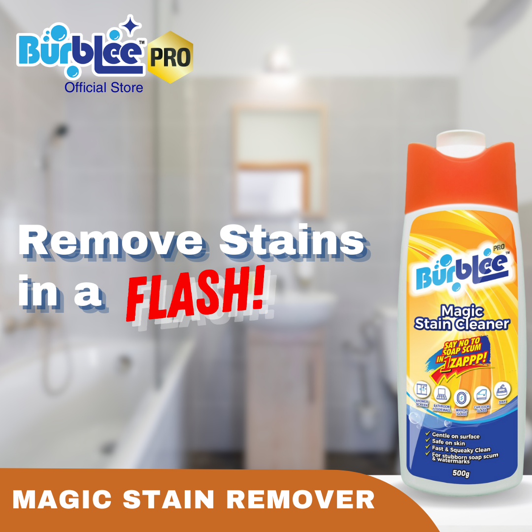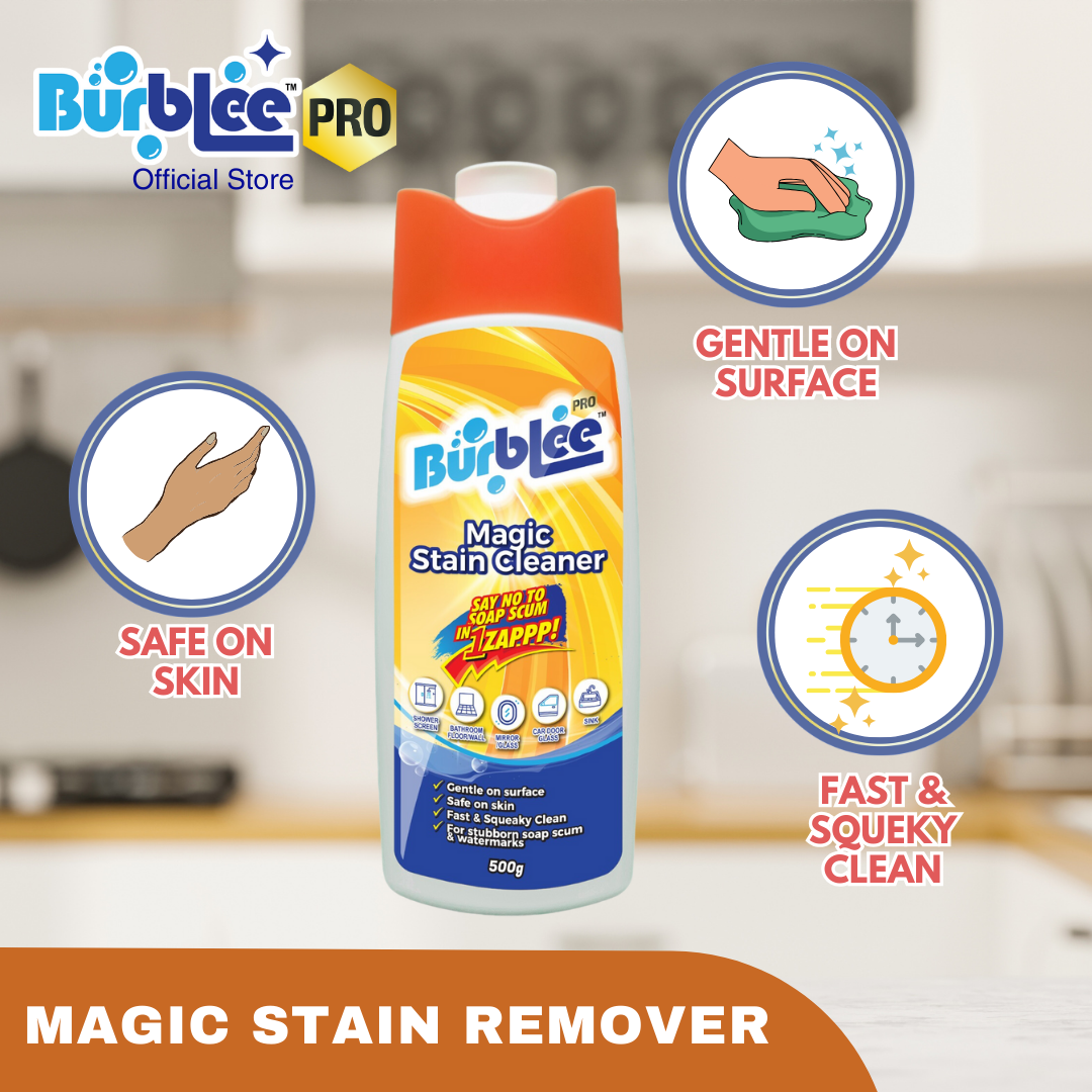 Burblee PRO Magic Stain Cleaner is the ultimate solution for effortlessly removing stubborn watermarks and unsightly soap scum. This is your go-to cleaner for restoring cleanliness like a magic on glass, tiles or any bathroom surfaces.