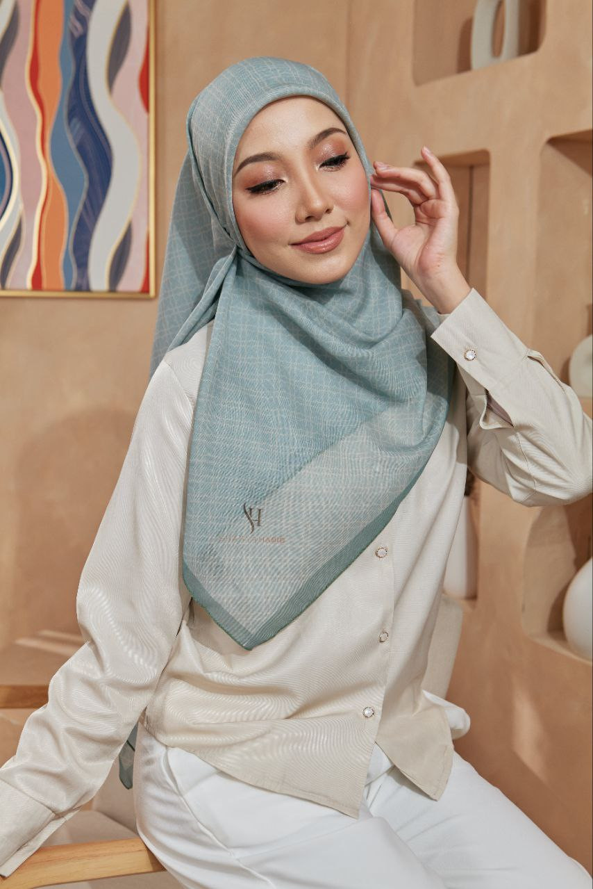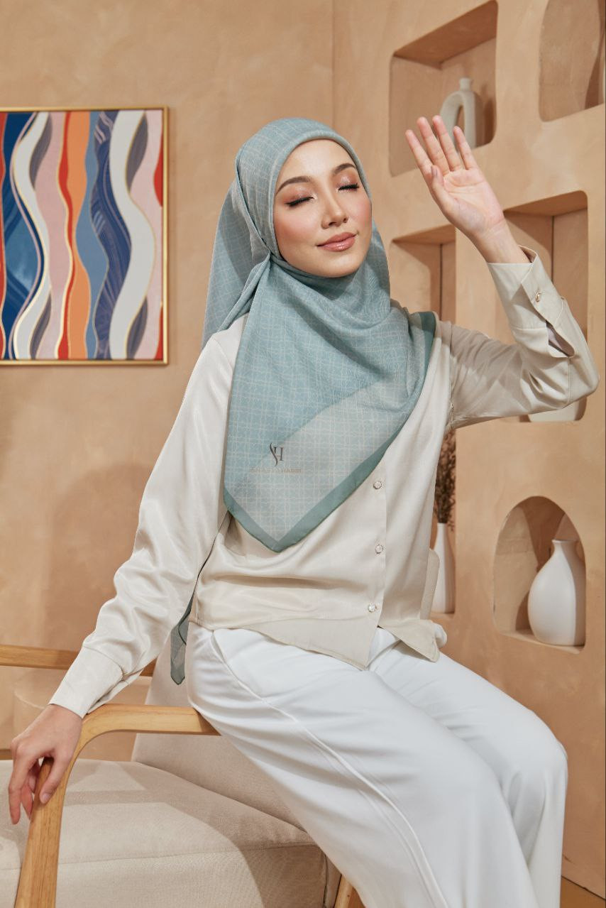 The "Feminine Treasures" hijab design elegantly blends modernity with heritage elements, featuring a monogram pattern intertwined with traditional motifs. The base colors of gray and cream create a sophisticated palette suitable for all occasions. This hijab adds a touch of elegance to your everyday look, ensuring you're effortlessly presentable no matter the setting.