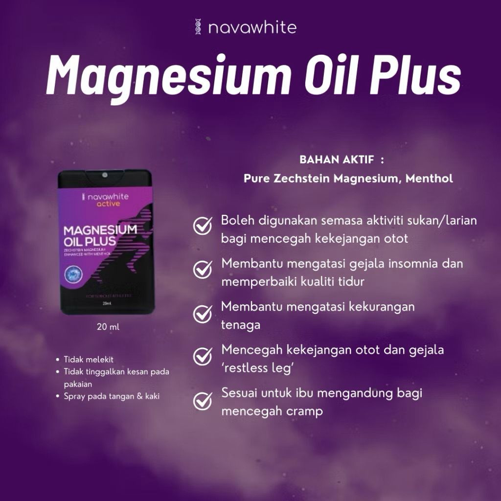 Kekurangan magnesium sebagai 'trace element' di dalam badan boleh menyebabkan kekejangan otot. Ini merupakan masalah yang sering terjadi di kalangan pelari, pendaki, pemain golf dan peminat sukan lasak yang lain. Navawhite Magnesium Oil Plus merupakan jawapan kepada masalah tersebut. Hanya semburkan pada kawasan yang dikehendaki dan biarkan ia meresap dan anda boleh sambung aktiviti dalam masa yang singkat. Ia juga boleh disemburkan pada tapak kaki untuk mendapatkan tidur yang nyenyak.