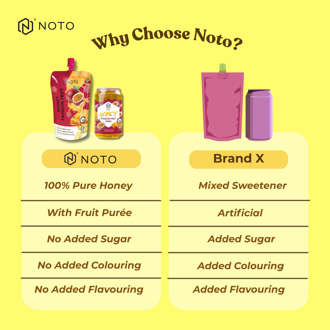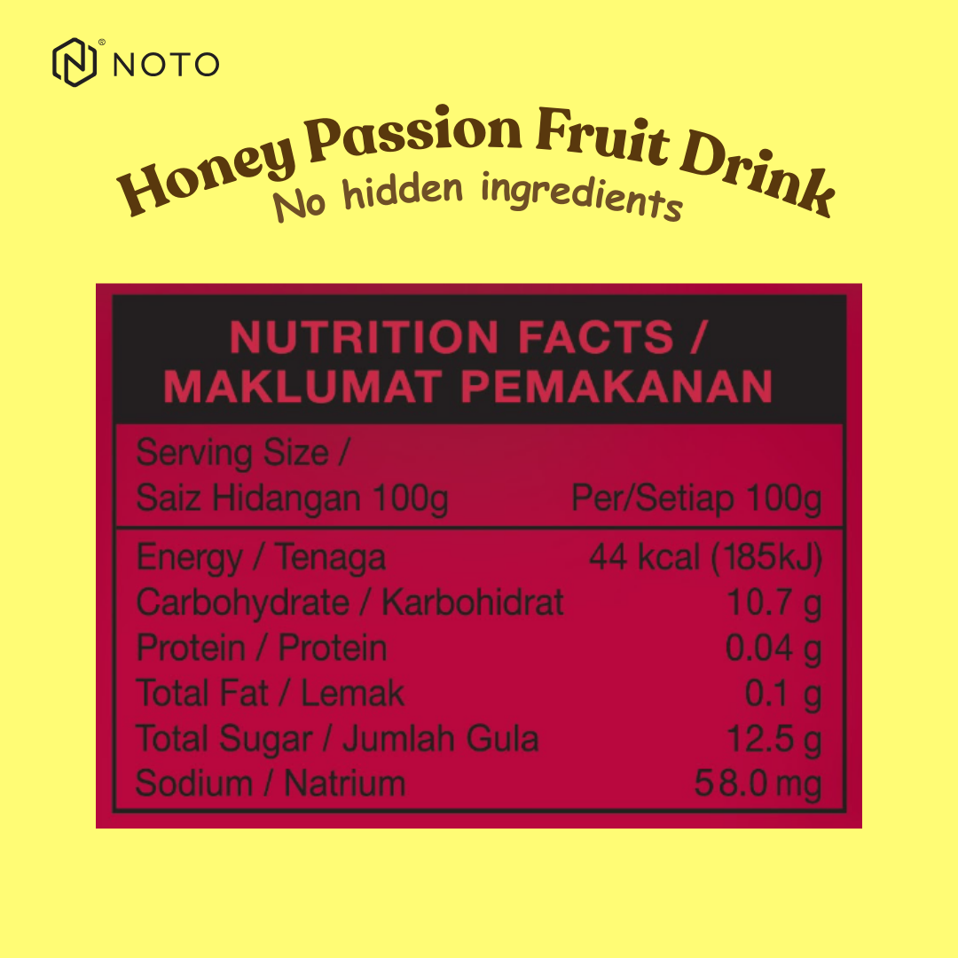 Dihasilkan daripada madu asli dan dicampur bersama air dan puri buah markisa sebagai bahan utama.