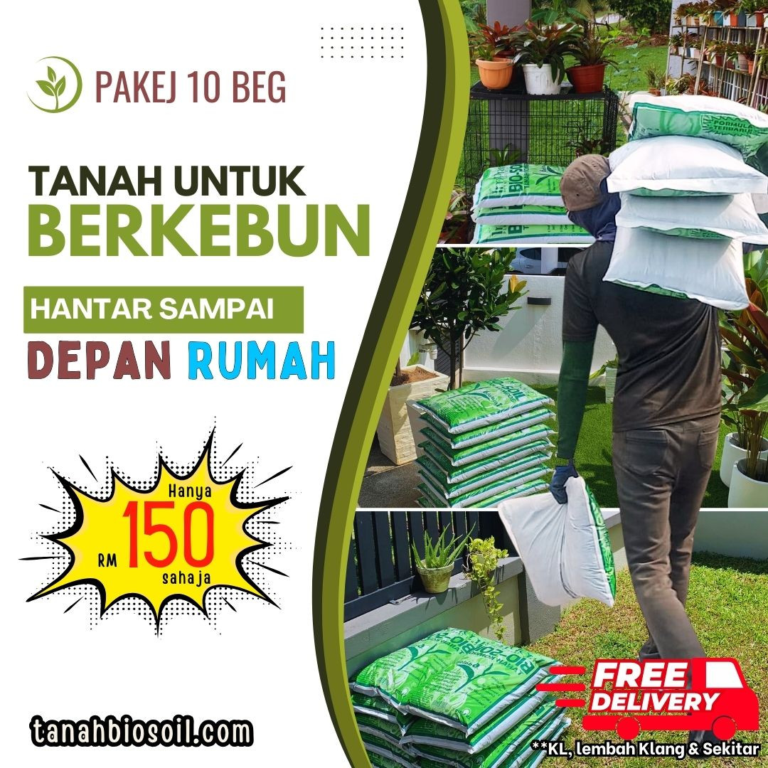 Pakej 10beg/RM150 Tanah Organik Biosoil dgn penghantaran percuma untuk kawasan KL/Lembah Klang termasuk Ampang, Gombak, Kepong, Sg.Besi, PJ, Damansara dan Bukit Kiara . 10 bag Tanah Biosoil ni berat dalam 120kg, ada barang FOC sekali dgn free delivery. Harga cuma RM150 sahaja dan boleh bayar secara COD (cash @ QR/Bank Transfer)