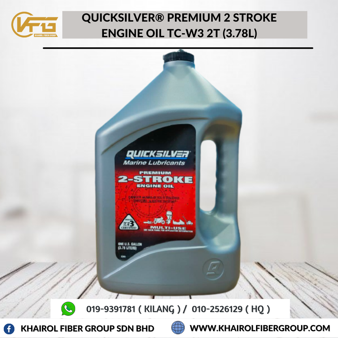 Quicksilver Premium 2-Stroke Outboard Oil memenuhi semua keperluan pengeluar terkemuka enjin lelang, kapal air peribadi, kereta salji, motosikal, gergaji rantai dan aplikasi 2-lejang air atau udara yang disejukkan yang menentukan penggunaan NMMA TC WIII dalam premix atau aplikasi 2-Stroke yang disuntik dengan minyak.