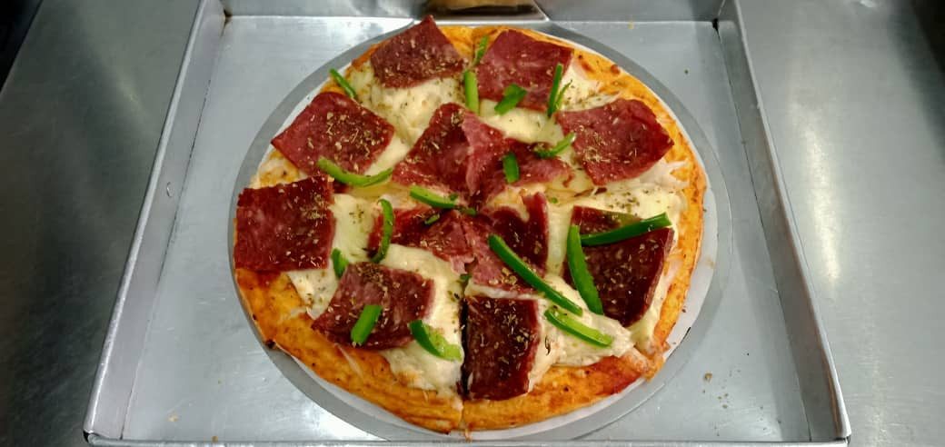 Tomato Concasse, Onion, Sauce Cheese, Mozzarella Cheese, Beef Loaf, Capsicum, Oregano & Chili Flakes.