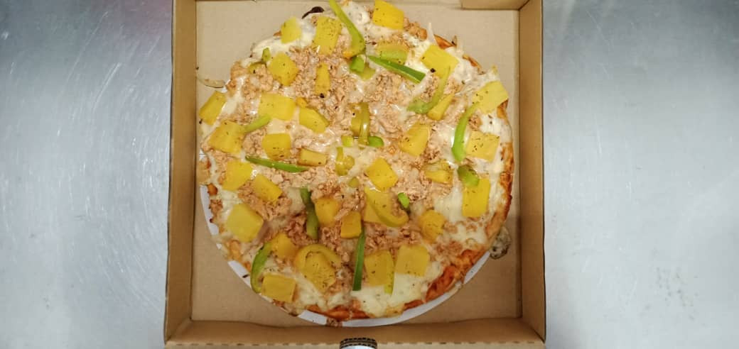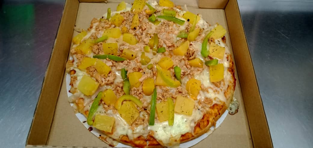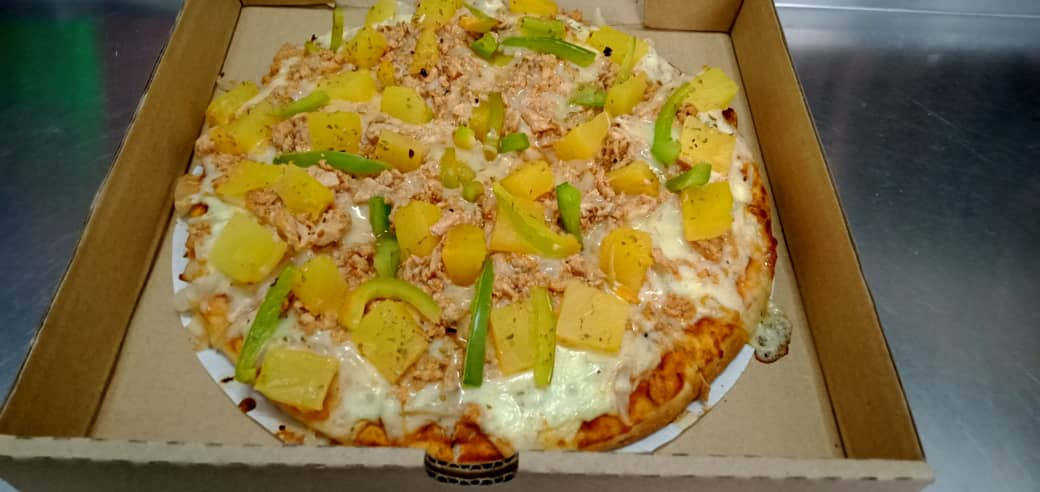 Tomato Concasse, Onion, Sauce Cheese, Mozzarella Cheese, Chicken Fillet, Pineapple Chunks, Capsicum, Oregano & Chili Flakes.