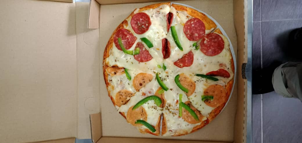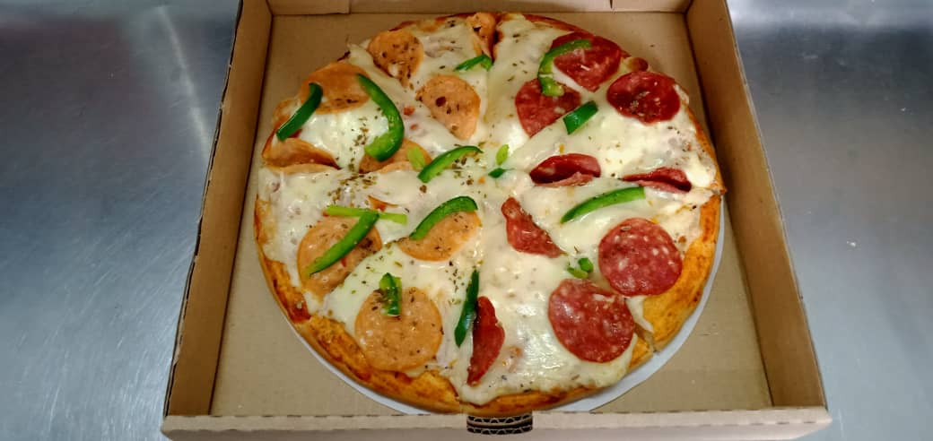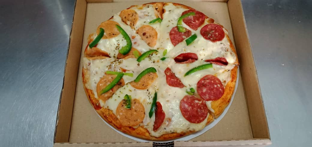 Tomato Concasse, Onion, Sauce Cheese, Mozzarella Cheese, Chicken Pepperoni, Beef Pepperoni, Capsicum, Oregano & Chili Flakes.