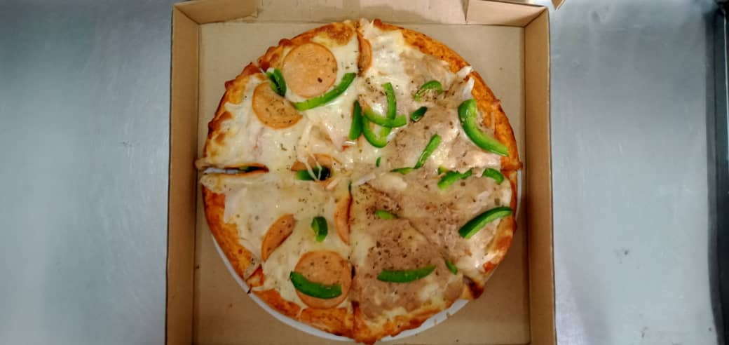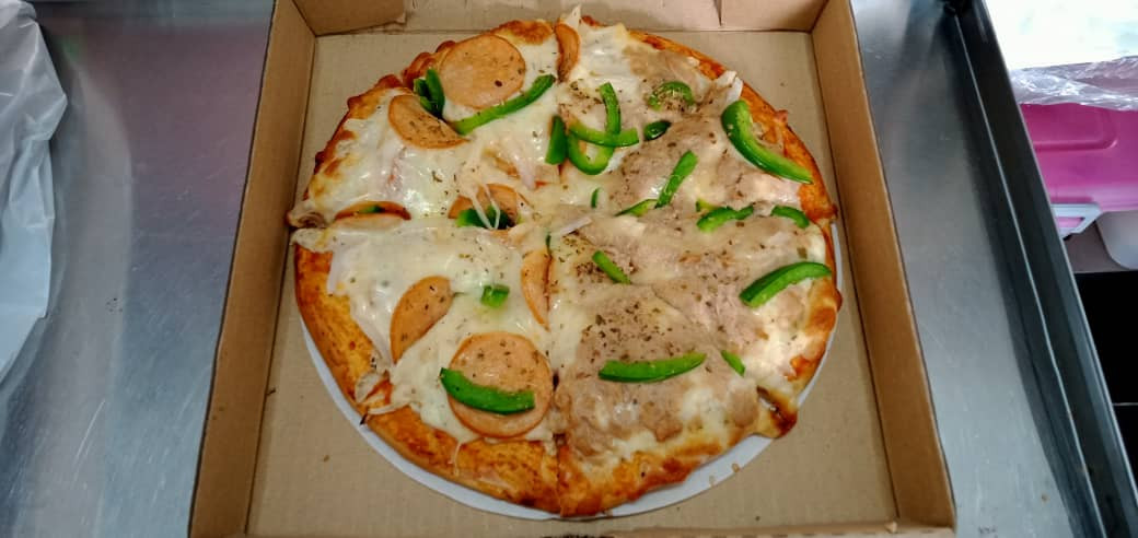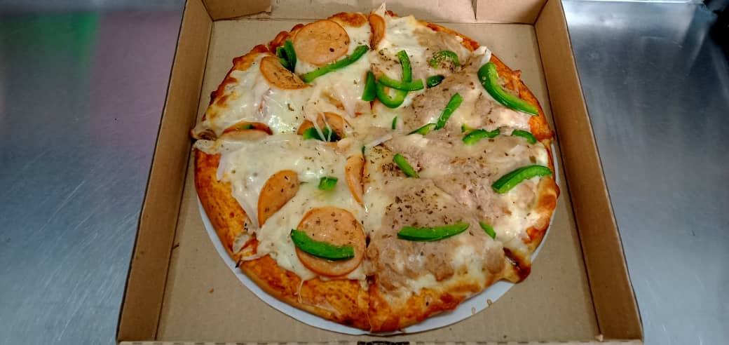 Tomato Concasse, Onion, Sauce Cheese, Mozzarella Cheese, Tuna Mayonaise, Chicken Pepperoni, Capsicum, Oregano & Chili Flakes.