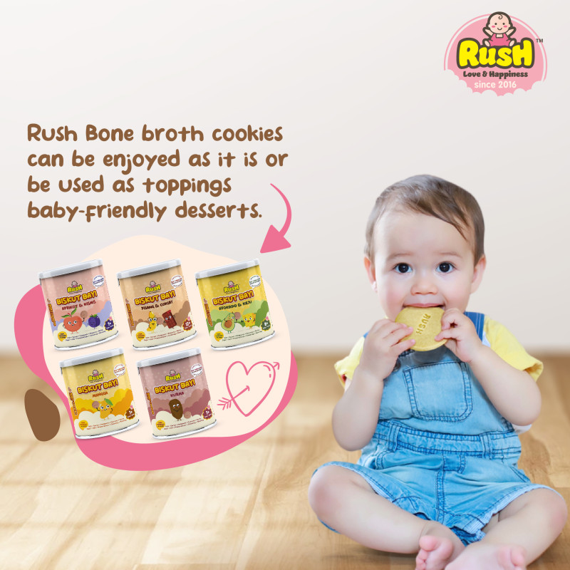 OF CHICKEN BONE BROTH * Help increase babies antibodies * Improve babies appetite * Strengthen growing bones & teeth * Supports immunity & digestion * Reduces the risk of allergies INGREDIENTS * Organic Chicken Bone Broth * Unsalted Butter * Unbleach Flour * Corn Flour * Mango Puree BONE BROTH COOKIES MANGO * Suitable for babies 7M+ * Made of Chicken Bone Broth * Ready to eat * No added sugar, salt, colouring & preservatives * Travel-friendly packaging Net Weight = 110g |