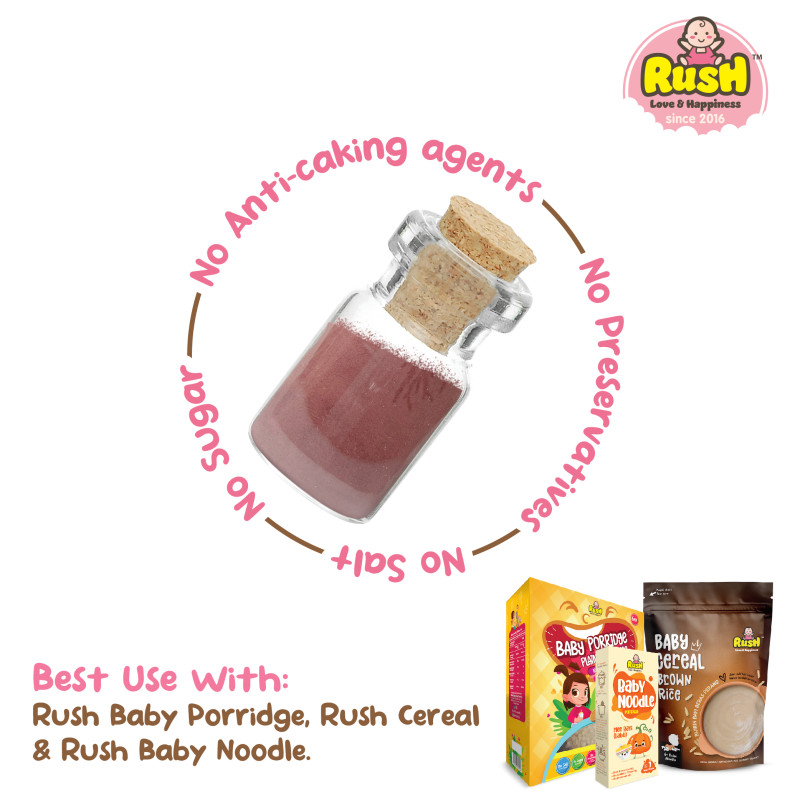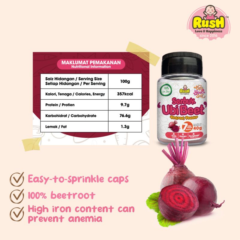 Seasoning Beetroot Powder * Suitable for Babies 6M+ * NO Added Sugar * NO Added Salt * NO Artificial Colours * NO Artificial Flouvor * NO Preservatives * Eay To use Bottle * Suitable fo all dishes INDGREDIENT * 100% Beetroot BEST USE WITH : * Rush Baby Porridge * Rush Baby Cereal * Rush Baby Noodle Pumpkin Net Weight = 40g |