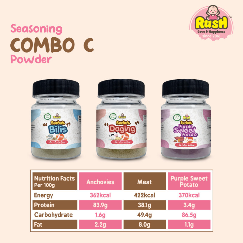 Seasoning Set Combo c * Suitable for Babies 8M+ * NO Added Sugar * NO Added Salt * NO Artificial Colours * NO Artificial Flouvor * NO Preservatives * Eay To use Bottle * Suitable fo all dishes INDGREDIENT * Anchovies: 100% Anchovies From Sabah * Meat: Lean Beef and White Pepper * Sweet Potato: 100% Purple Sweet Potato Net Weight = 63g * Anchovies 20g * Meat 18g * Purple Sweet Potato 25g |