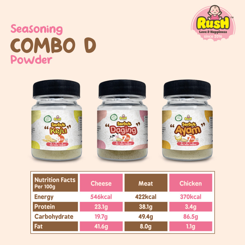 Seasoning Combo D * Suitable for Babies 8M+ * NO Added Sugar * NO Added Salt * NO Artificial Colours * NO Artificial Flavour * NO Preservatives * Easy To use Bottle * Suitable fo all dishes INGREDIENT * Cheese: 100% Cheddar Cheese * Meat: 99.9% Meat and 0.1% White Pepper * Chicken: Antibiotic Free Chicken, Olive Oil, Ginger, Garlic and White Pepper Net Weight = 56g * Cheese 18g * Meat 18g * Chicken 20g |