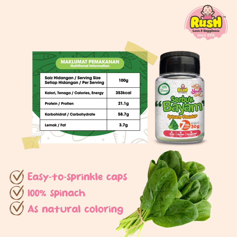 Seasoning Spinach Powder * Suitable for Babies 6M+ * NO Added Sugar * NO Added Salt * NO Artificial Colours * NO Artificial Flouvor * NO Preservatives * Eay To use Bottle * Suitable fo all dishes INDGREDIENT * 100% Spinach BEST USE WITH : * Rush Baby Porridge * Rush Baby Cereal * Rush Baby Noodle Pumpkin Net Weight = 30g |