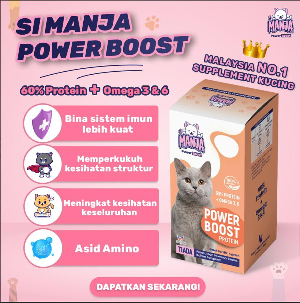 Memperkenalkan suplemen kucing semulajadi kami, Si Manja Power Boost yang dirumus untuk membantu anak bulus anda mendapatkan berat badan yang sihat dan mengurangkan keguguran bulu sambil juga menggalakkan perasaan penuh (kenyang lama) dan meningkatkan selera makan mereka.